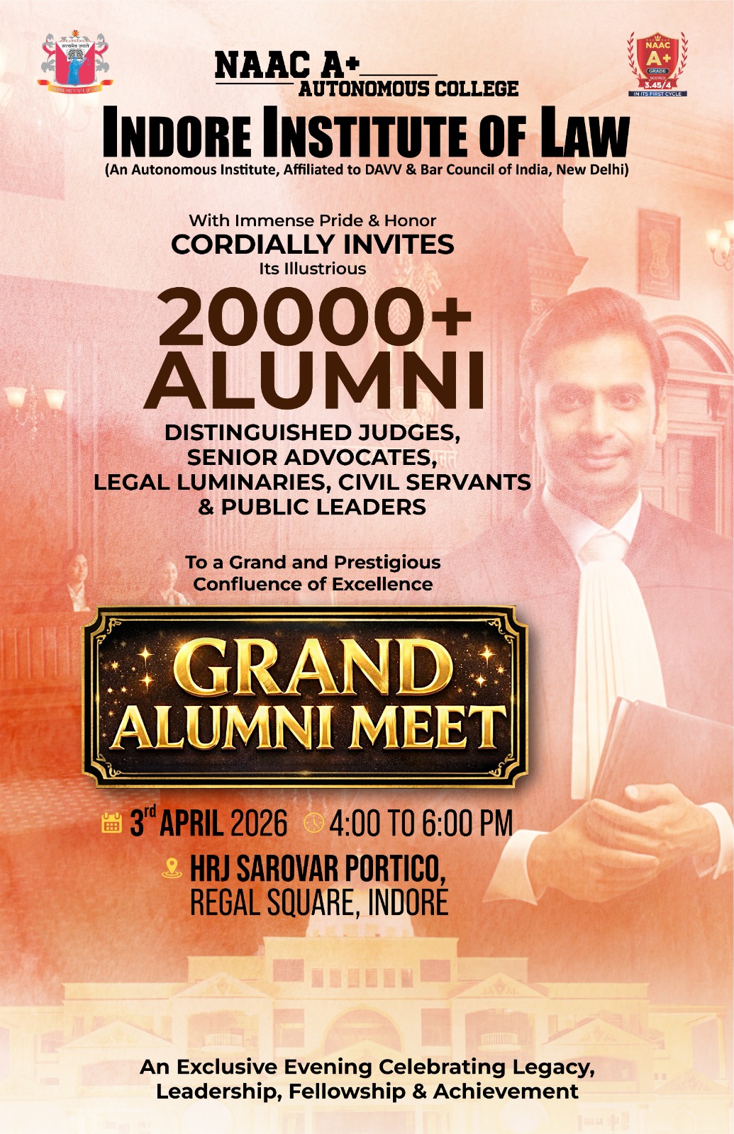 Our approach to education combines academic rigor with practical experience and extracurricular activities. We ensure that the flow of knowledge remains constant, nurturing diligent learners with a bright future. We wish our students a fruitful academic journey and a successful career ahead. We take pride in our contribution to strengthening the legal fraternity, with over 18,000 alumni who have gone on to become 72 Civil Judges, 2 DSPs, 1 SP, numerous ADPOs, 1 MLA, 1 MP, and 1 JAG.